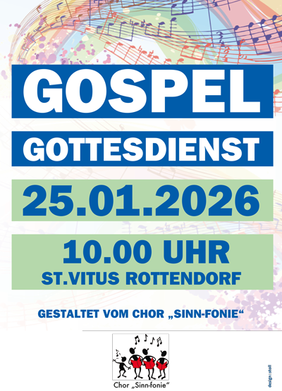 Der Chor „Sinn-fonie“ gestaltet am 25.01.2026 um 10:00 Uhr in St. Vitus einen Gottesdienst mit modernen Gospel Songs und meditativen Texten.